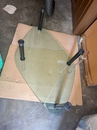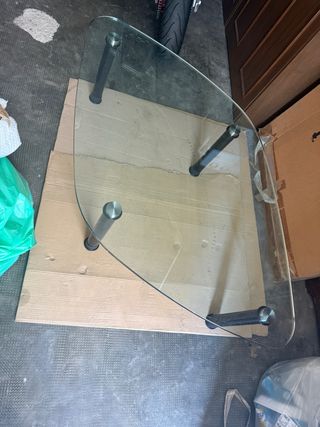 Tavolino da caffè in vetro e metallo dal design moderno. Perfetto per un salotto elegante e funzionale. - Piano in vetro trasparente di forma irregolare. - Struttura con 4 gambe in metallo nero. - In ottime condizioni.