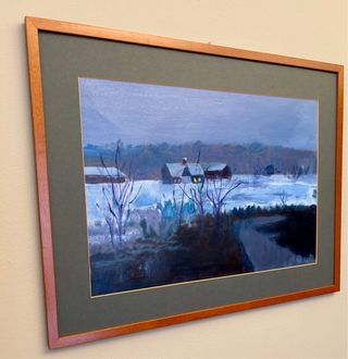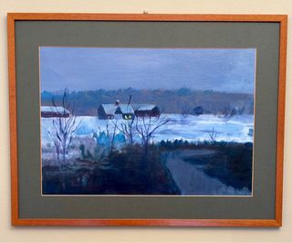 Dipinto ad olio raffigurante un paesaggio invernale. I colori sono tenui e creano un'atmosfera suggestiva. - Dipinto su tela realizzato da me come esercizio scolastico. - Cornice leggera in legno di colore marrone scuro dimensioni 62 x 48