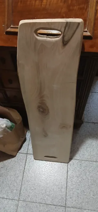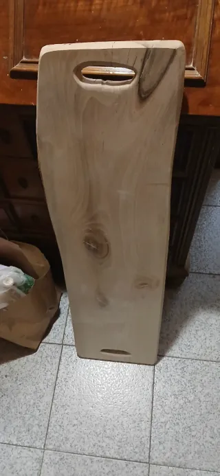 Ampio tagliere in legno grezzo, perfetto per la tua cucina. La sua forma irregolare e le venature naturali lo rendono un pezzo unico. - Due comodi fori per la presa. - Bordi naturali e finitura liscia.