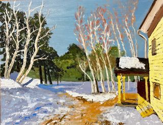 Dipinto ad olio su pannello in legno 60 x 50 raffigurante una casa sul limitare del bosco in inverno.