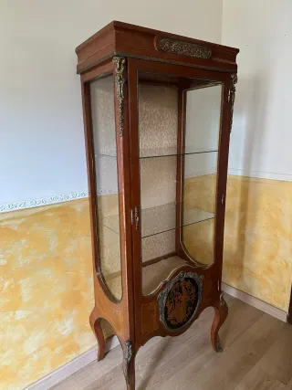 Elegante vetrina antica con dettagli in metallo e finiture in legno. - Struttura in legno con intarsi. - Dettagli decorativi in metallo dorato. - Ripiani in vetro. - Base con decorazione a intarsio.