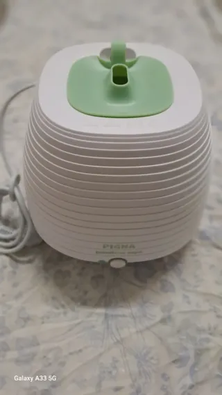 Diffusore di essenze PIGNA, dal design moderno e pulito. La base è bianca con una finitura a coste, mentre il coperchio superiore è di un vivace colore verde. -Funzione di spegnimento automatico. - Base bianca con finitura a coste. - Coperchio superiore verde. - Pulsante di accensione/spegnimento sul davanti.