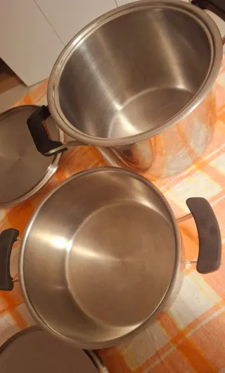 Set di pentole IMCO in metallo e plastica. - Design elegante in argento e nero. - Manici ergonomici in plastica. Casseruola più due tegami con rispettivi coperchi. Mis in foto. Nota bene,il tegame più grande,il coperchio ha il pomello sistemato poichè si era rotto