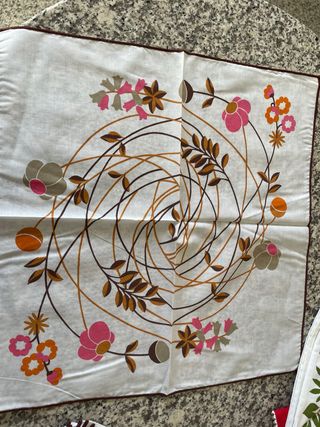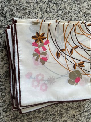 Set di 12 tovaglioli con un allegro disegno floreale nuovi mai utilizzato - Misura 40x40 cm. - Design con fiori e rami stilizzati. - Bordatura marrone scuro.