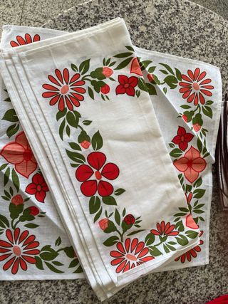 Set di 6 tovaglioli in tessuto con un vivace motivo floreale. Nuovi mai utilizzati - Misura 40x40 cm. - Design con fiori rossi e foglie verdi su sfondo bianco.