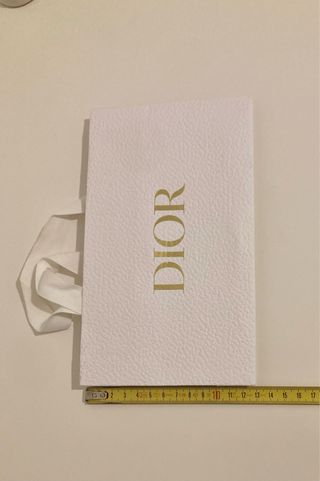 Elegante set composto da scatola e shopping bag firmati Dior. - Scatola in carta texturizzata. - Shopping bag con manici in nastro. - Logo Dior dorato in rilievo. NB SCATOLA VUOTA - NON CONTIENE PRODOTTI