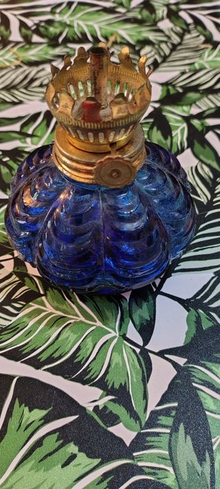 Lampada a olio in vetro blu e metallo dorato