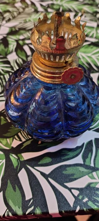 Elegante lampada a olio con un design ricercato. - Base in vetro blu lavorato. - Dettagli in metallo dorato.