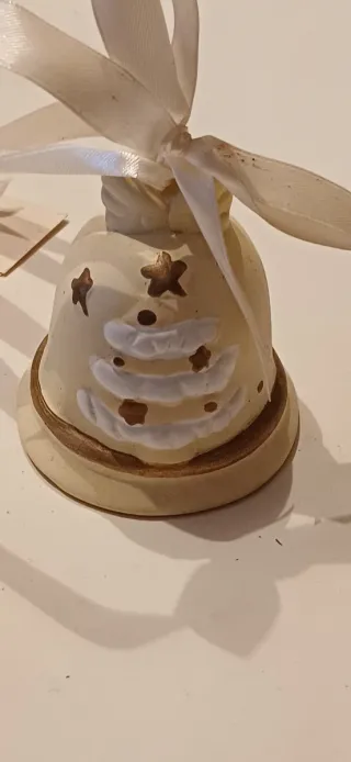 Deliziosa campanella decorativa, perfetta per aggiungere un tocco natalizio. - Design a forma di campana. - Decorazione con albero di Natale stilizzato e stelle. - Nastro per appenderla inclusa.