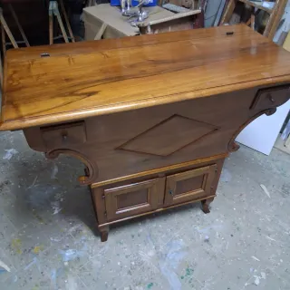Madia in noce restaurata, un mobile elegante e funzionale. - Realizzata in legno di noce. - Design classico con intaglio a rombo. - Dotata di cassetti e ante per un'ottima capienza.