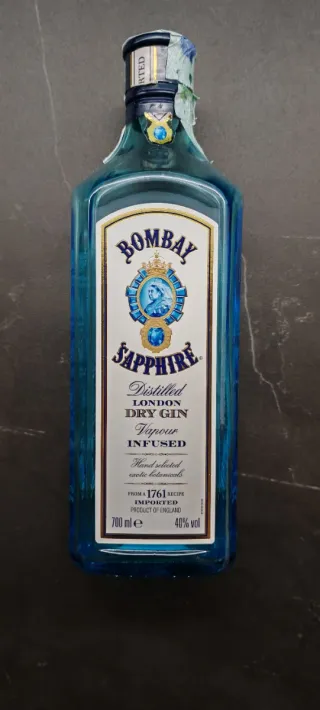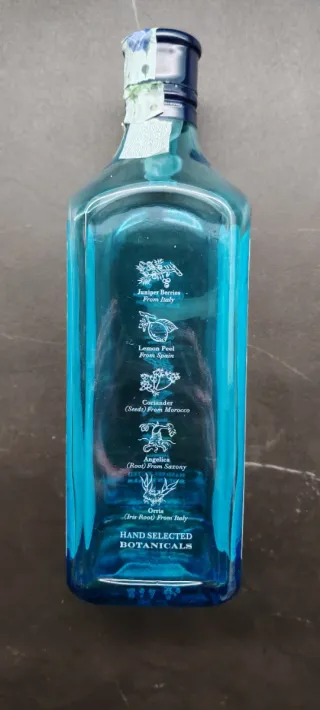 Bottiglia vuota di Bombay Sapphire London Dry Gin. - Design iconico in vetro blu. - Etichetta dettagliata con logo e informazioni sul prodotto. - Ideale per collezionisti o come oggetto decorativo.