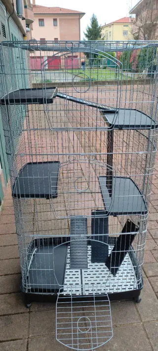 Gabbia spaziosa e robusta, ideale per cincillà e furetti. Dispone di più livelli e rampe per il movimento degli animali. - Struttura in metallo resistente. - Vassoi estraibili per una facile pulizia. - Ruote per spostarla comodamente. - Altezza circa 150 cm