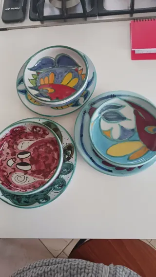 Set di tre posti tavola in ceramica, ognuno con un design unico e colorato. - Pezzi decorati a mano. - diametro piatto piano cm 23 - diametro esterno fondina cm 18 Eventuali piccole imperfezioni sono dovute alla lavorazione interamente a mano. In omaggio 3 tovagliette rotonde in paglia :diametro cm 37
