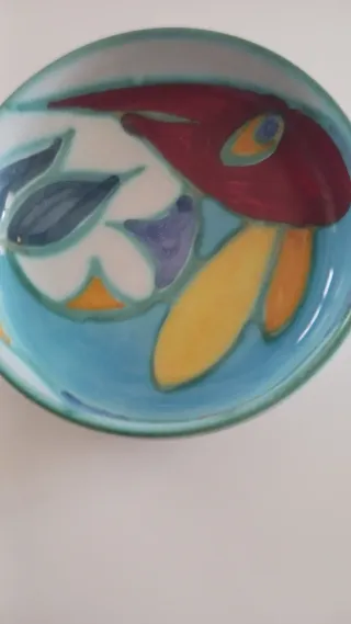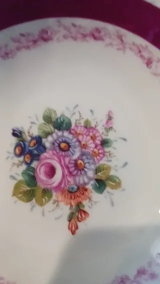 Elegante ciotola Limoges con un delicato motivo floreale al centro. Può essere uno svuota tasche, porta cioccolatini o semplicemente un soprammobile - Bordo decorato con una fascia color prugna. - Motivo floreale dipinto a mano con rose, margherite e fiori blu. - Finitura lucida. - diametro cm 13