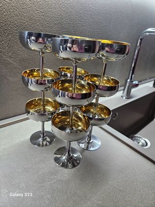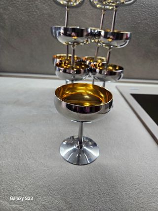 Elegante set di 10 coppe da cocktail/champagne in metallo cromato con interno dorato. Design raffinato e retrò, ideale per occasioni speciali o come elemento decorativo. In ottime condizioni, perfette per collezionisti o amanti dello stile vintage.