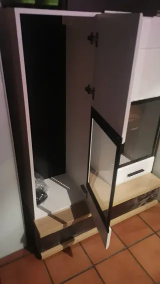Set di mobili versatili per diverse aree della casa (soggiorno, cucina, bagno o camera). Combinazione di colori bianco e marrone. Realizzati in legno e vetro. Vendo perché non mi stanno nella mia nuova casa. Sono 6 mobili, 2 gemelli con porta in vetro (160€), 2 gemelli con vetro e led (180€), 1 armadio con porta orizzontale (45€), 1 mobile per TV o simile (85€). Costo totale 470€. Risparmia 375€.