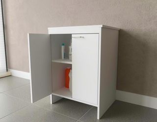 Mobile di stoccaggio con finitura laccata in bianco. Design impermeabile ideale per il bagno. Costruzione in legno resistente.