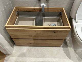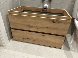 Mobile bagno modello Madrid con finitura in rovere. Dimensioni 80x45 cm. Design con tre cassetti. Gambe metalliche argentate. Non include lavabo. Come nuovo, un anno di utilizzo. Di Leroy Merlin (180 euro).