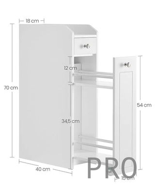 PREZZO ONLINE: 51,99€ STATO: NUOVO DIFETTO: NESSUNO LOCALIZZAZIONE: E-A/P5/E3/F3 CODICE: 63341 Questo compatto armadio da 40 x 18 x 70 cm si adatta facilmente allo spazio stretto tra lo sciacquone e la parete del bagno o in piccoli spazi della cucina per aggiungere spazio utile. VASAGLE Armadio da Bagno, Armadio Stretto da Terra, Porta Carta Igienica, con Cassetti, per Spazi Piccoli, Bianco BBC847P31