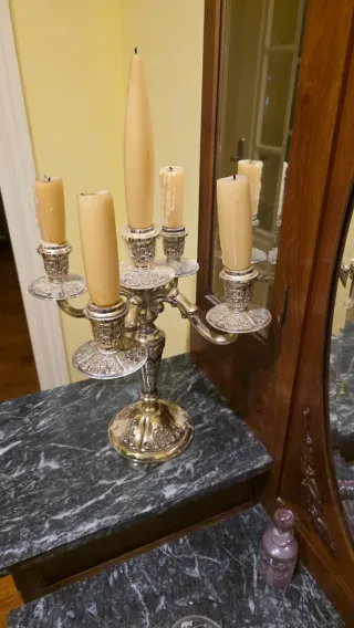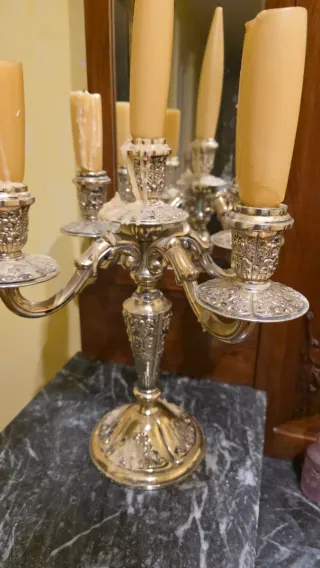 Elegante candelabro da tavolo con un design classico e ornamentale. Perfetto per aggiungere un tocco di distinzione a qualsiasi spazio. Ha 80 anni ed è in perfette condizioni. - Placcato in argento. - Base in metallo con dettagli intagliati. - Cinque bracci per candele.