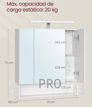 Mobile bagno VASAGLE con illuminazione LED, 16,5 x 70 x 75 cm, presa multipla, cesta a sospensione, supporto asciugacapelli, per lavabo, bianco nuvola BBK126W01