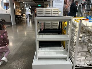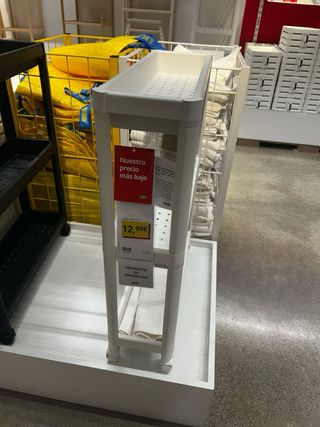 Carrello di stoccaggio Vesken di IKEA, perfetto per organizzare il bagno o qualsiasi spazio. Design a tre livelli con vassoi. Struttura sottile e alta. Ruote per facile mobilità.