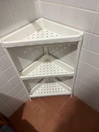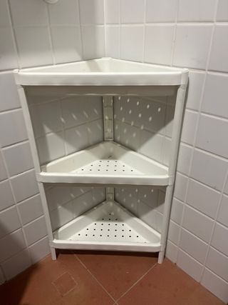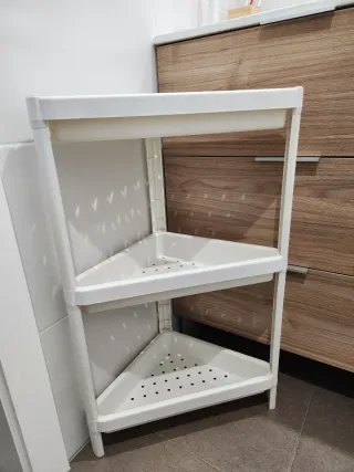 Scaffale angolare pratico di Ikea, modello VESKEN. Perfetto per organizzare il bagno o qualsiasi angolo. Design triangolare, tre livelli, realizzato in plastica resistente. Dimensioni: 33*33*71.