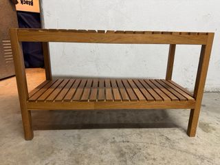 Banco o scaffale Ikea modello Muskan in perfette condizioni. Ideale per bagno o qualsiasi stanza. Design a stecche per ventilazione. Due livelli di stoccaggio. Misure 58x38x50cm. Nuovo costa 50€ da Ikea.