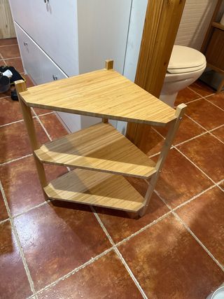 Scaffale angolare in bambù, perfetto per organizzare il bagno o qualsiasi angolo. Realizzato in bambù e legno. Design a tre livelli. Colore naturale del legno.