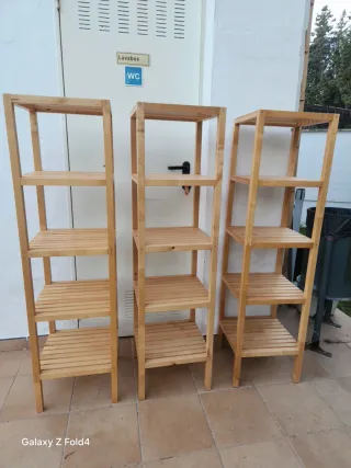 Tre scaffalature in legno di Ikea, in perfette condizioni. Un design aperto e leggero con molteplici ripiani, ideale per diverse stanze come il bagno o la cucina. Il prezzo è per le tre scaffalature, ma si vendono anche separatamente, se sei interessato non esitare a scrivermi.