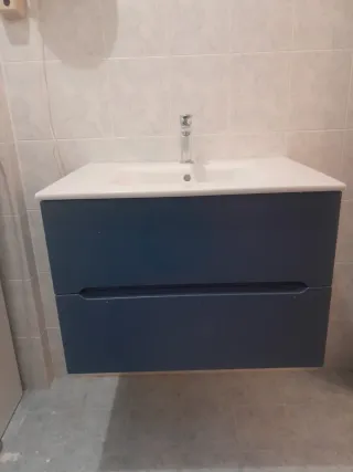 Mobile da bagno e pensile color Indaco, mai utilizzati. Misure: lavabo lunghezza 70 cm, 50 cm profondità. Pensile lunghezza 30 cm. - Mobile sospeso con due cassetti. - Pensile con anta. - Finitura opaca.