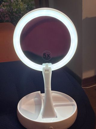 Specchio da trucco con ingrandimento 5X e illuminazione LED integrata. - Design pieghevole e portatile. - Base con scomparti per riporre accessori. - Luce anulare per un'illuminazione uniforme.