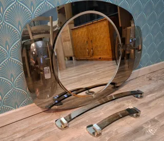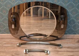 Elegante specchio da bagno vintage con un design unico e raffinato. Completo di accessori coordinati per un tocco di classe. - Forma ovale con cornice in metallo. - Dettagli in vetro fumé. - Include due accessori da parete. - anni 60