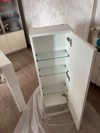 Mobile contenitore per bagno, ideale per organizzare i tuoi oggetti. - Struttura in legno. - Finitura lucida. Una mensola in vetro é leggermente scheggiata in un angolo
