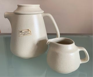 Splendida caffettiera e lattiera in gres ceramico disegnata dal maestro Franco Bucci (1933-2002) per Arte Ceramica Romana (ACR), prodotta a Pomezia negli anni '70. Con etichetta originale per collezionisti