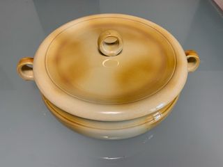 Elegante zuppiera vintage, perfetta come centrotavola. Realizzata in ceramica con sfumature di colore giallo senape. Mancioli montelupo