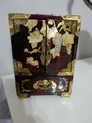 Questo oggetto è un portagioie cinese d'epoca in legno laccato con decorazioni in madreperla e rinforzi in ottone. Presenta intarsi in madreperla raffiguranti motivi botanici e animali. È dotato di ante frontali e un cassetto inferiore. La struttura include angolari e chiusure decorative in ottone. Cm 21 per 16 epoca primi del 900 con lucchetto