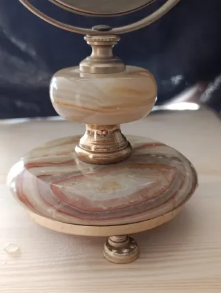 Elegante specchio da tavolo antico, un pezzo decorativo che aggiunge un tocco di classe. - Base in pietra con venature multicolore. - Struttura in metallo dorato. - Design classico e raffinato.