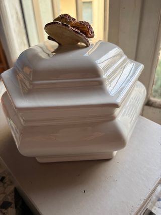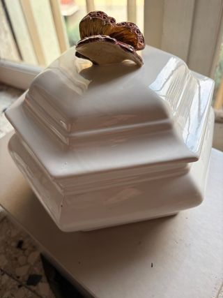 Elegante zuppiera vintage con una base esagonale e un coperchio decorato con una farfalla. - Design unico con finiture dettagliate. - Materiale in ceramica resistente.