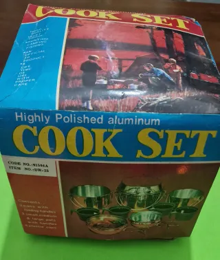 Set da campeggio vintage composto da pentole e tazze. Nuovo in confezione in alluminio, bellissime. - Pentole in metallo con manici. - Tazze in plastica color beige. - Ideale per escursioni e attività all'aperto.