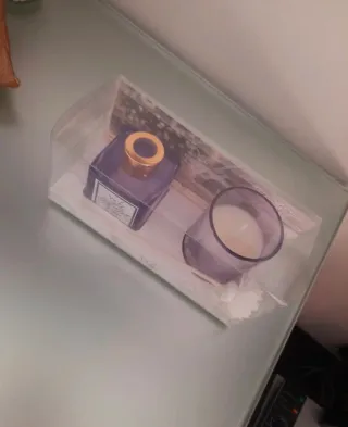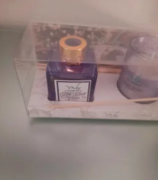 Set composto da un profumatore per ambienti e una candela profumata, presentati in una confezione regalo. - Profumatore in vetro con tappo dorato. - Candela in bicchiere di vetro. - Decorazione floreale inclusa.