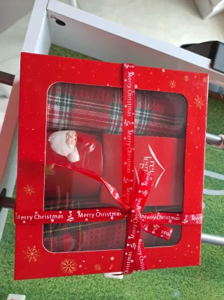 Scatola regalo a tema natalizio, perfetta per un pensiero speciale. - Decorazioni a tema natalizio. - Fiocco rosso con scritta Merry Christmas. - Finestra trasparente per visualizzare il contenuto. - Composto da 2 strofinacci natalizi e una candela - In confezione originale - Ottimo come idea regalo