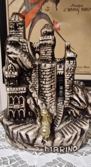 Raffinata bottiglia a forma di castello, ispirata a San Marino. Un pezzo unico che aggiunge un tocco di eleganza. - Design a forma di castello. - Dettagli architettonici elaborati. - Base con scritta San Marino.