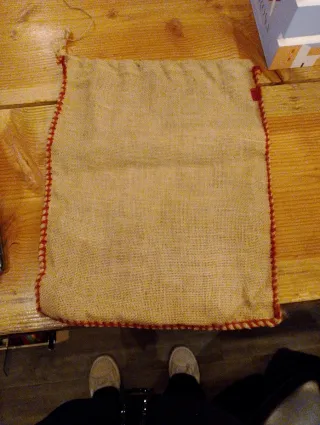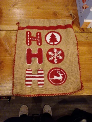 Sacchetto regalo natalizio in juta, perfetto per contenere i doni di Babbo Natale. - Decorazione HO HO HO con renna, albero e fiocco di neve. - Cordino per chiusura. - Bordi rifiniti con nastro rosso.