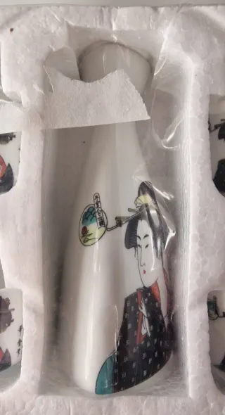 Elegante servizio da tè o sake in porcellana, perfetto per occasioni speciali o per aggiungere un tocco di raffinatezza alla tua casa. Il set include una bottiglia e quattro tazze, ognuna decorata con un motivo tradizionale giapponese. - Bottiglia per sake/tè - Quattro tazze abbinate - Decorazione con motivo tradizionale