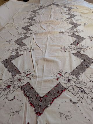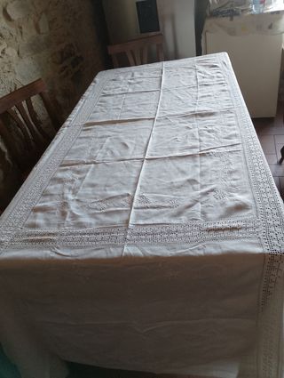 Bellissima tovaglia antica in lino, perfetta per chi ama lo stile vintage. - Ricamata a mano con motivi floreali - Presenta un delicato pizzo ai bordi - Misure generose, ideale per tavoli grandi
