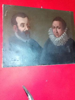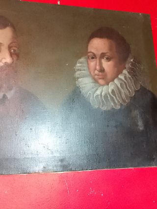Bellissimo dipinto antico raffigurante un ritratto di personaggi, I colori sono scuri e caldi, creando un'atmosfera suggestiva. - Dipinto a olio su tela - Soggetti: uomo e donna in abiti d'epoca - Ottimo stato di conservazione, considerando l'età
