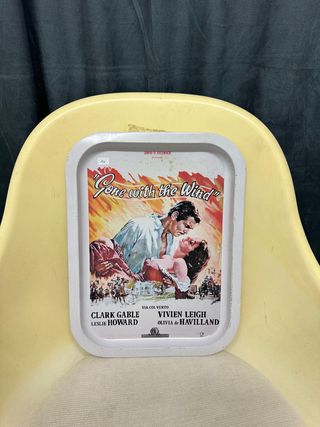 Vassoio vintage con la locandina del film Via col Vento. - Raffigura Clark Gable e Vivien Leigh. - Presenta i nomi del cast principale. - Design ispirato al classico cinematografico.