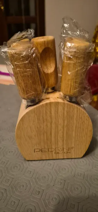 Elegante set per formaggio Pedrini con tagliere e coltelli. - Manici in bambù. - Lame in metallo. - Supporto in legno.