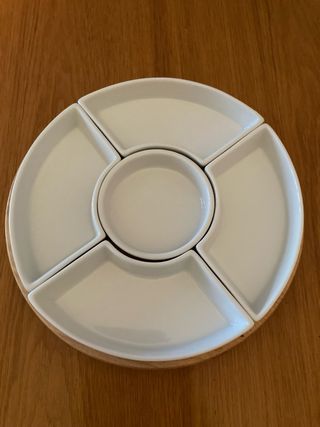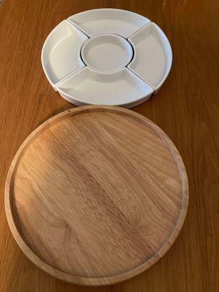 Elegante antipastiera girevole, perfetta per servire stuzzichini e salse. - Base in legno naturale. - Vassoi in ceramica bianca. - Design moderno e funzionale.